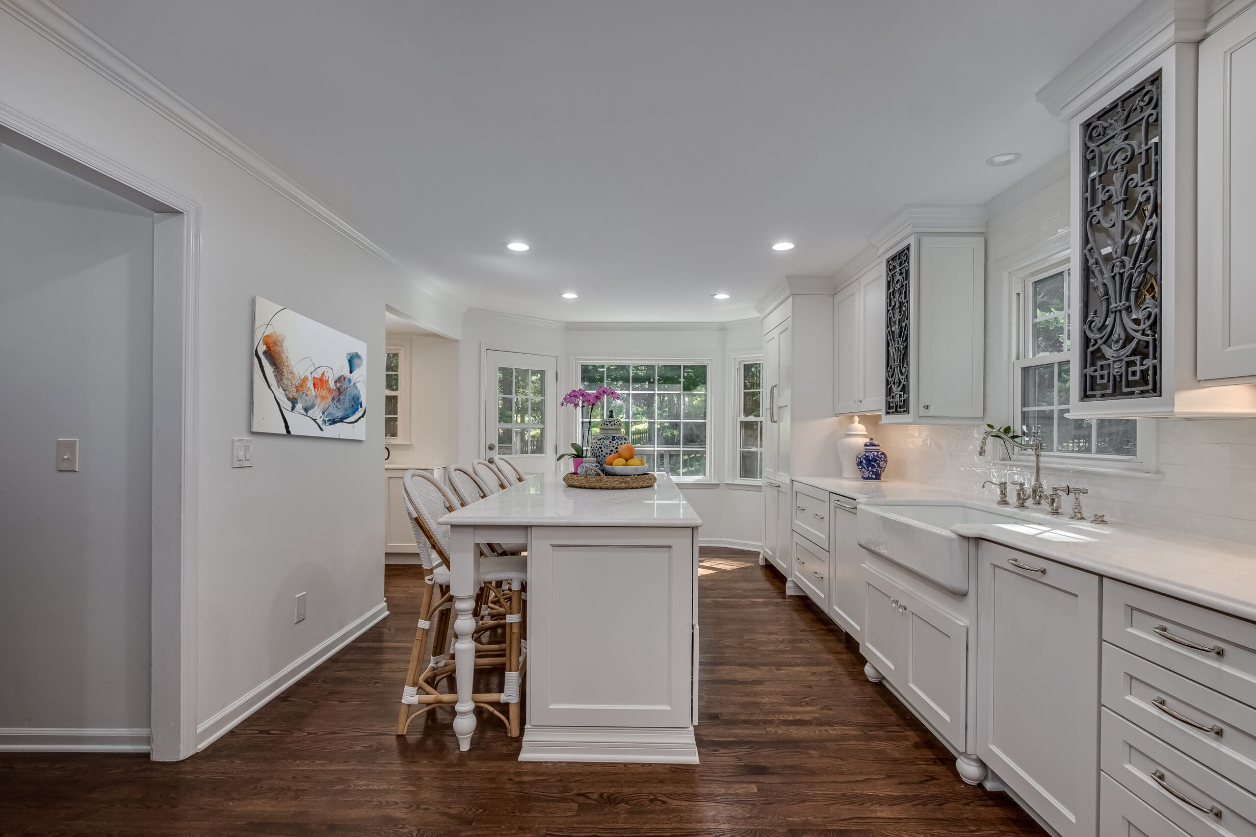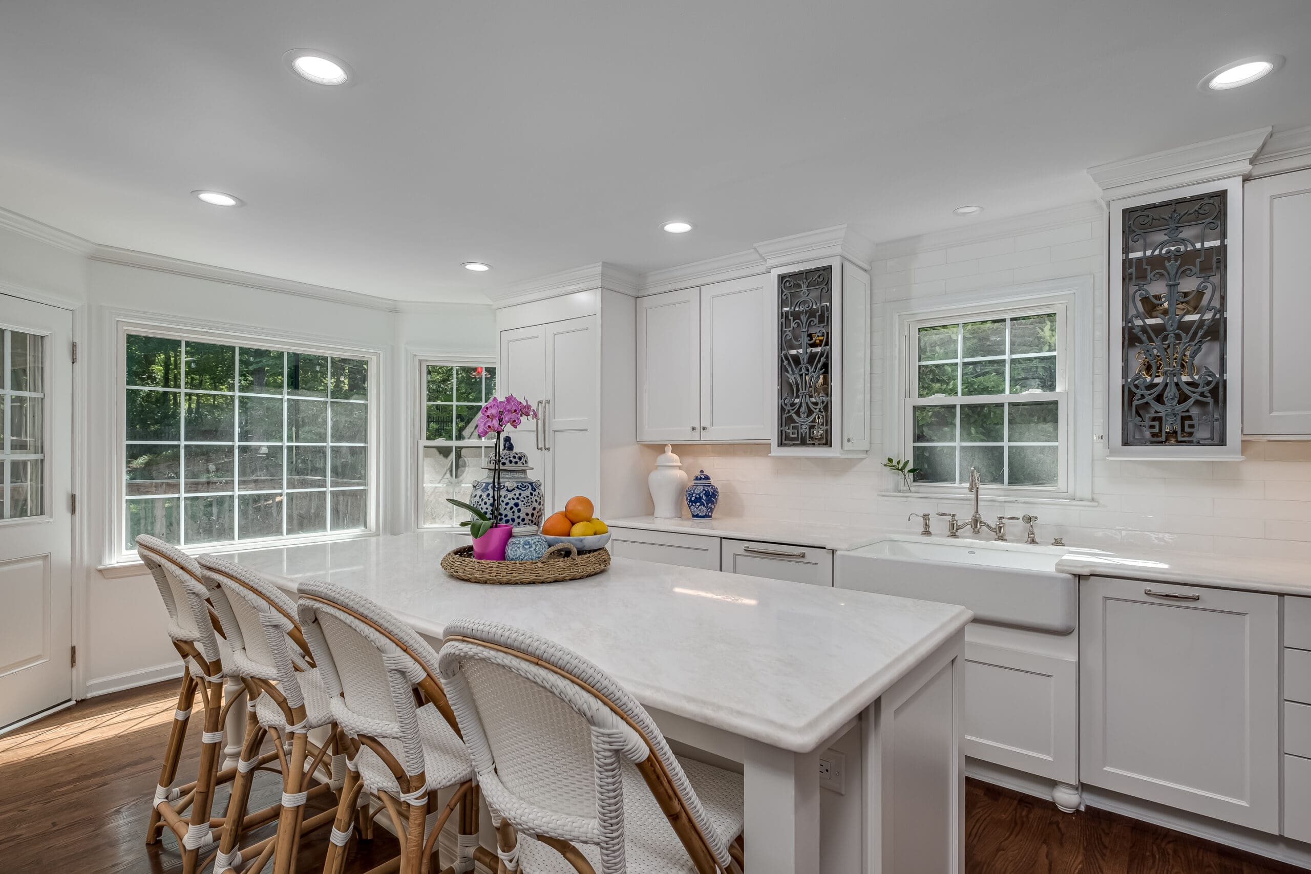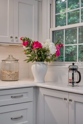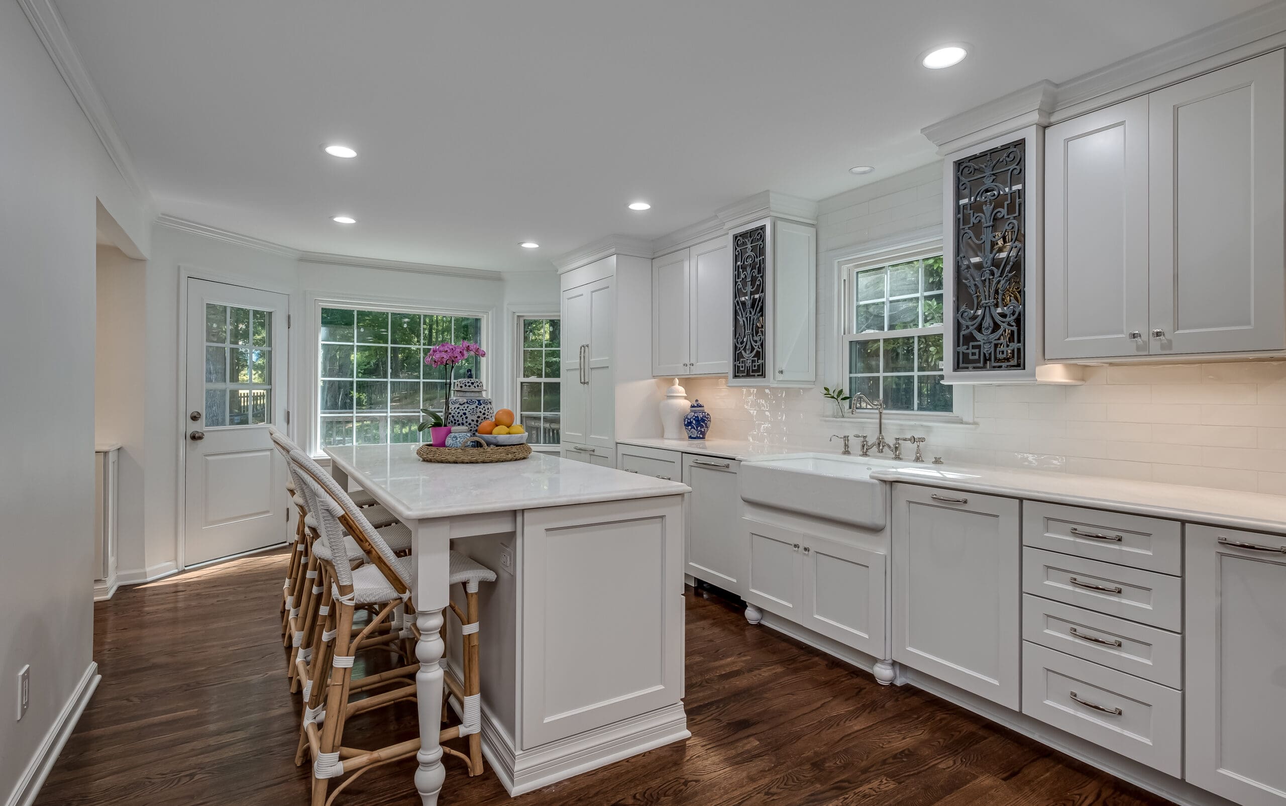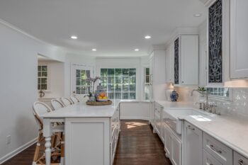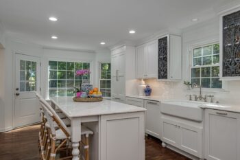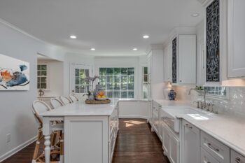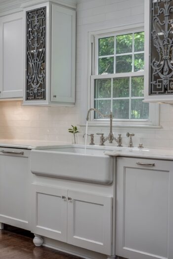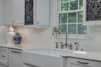 - Added a farmhouse sink + designer fixtures as the perfect “jewelry” to the all-white cabinetry