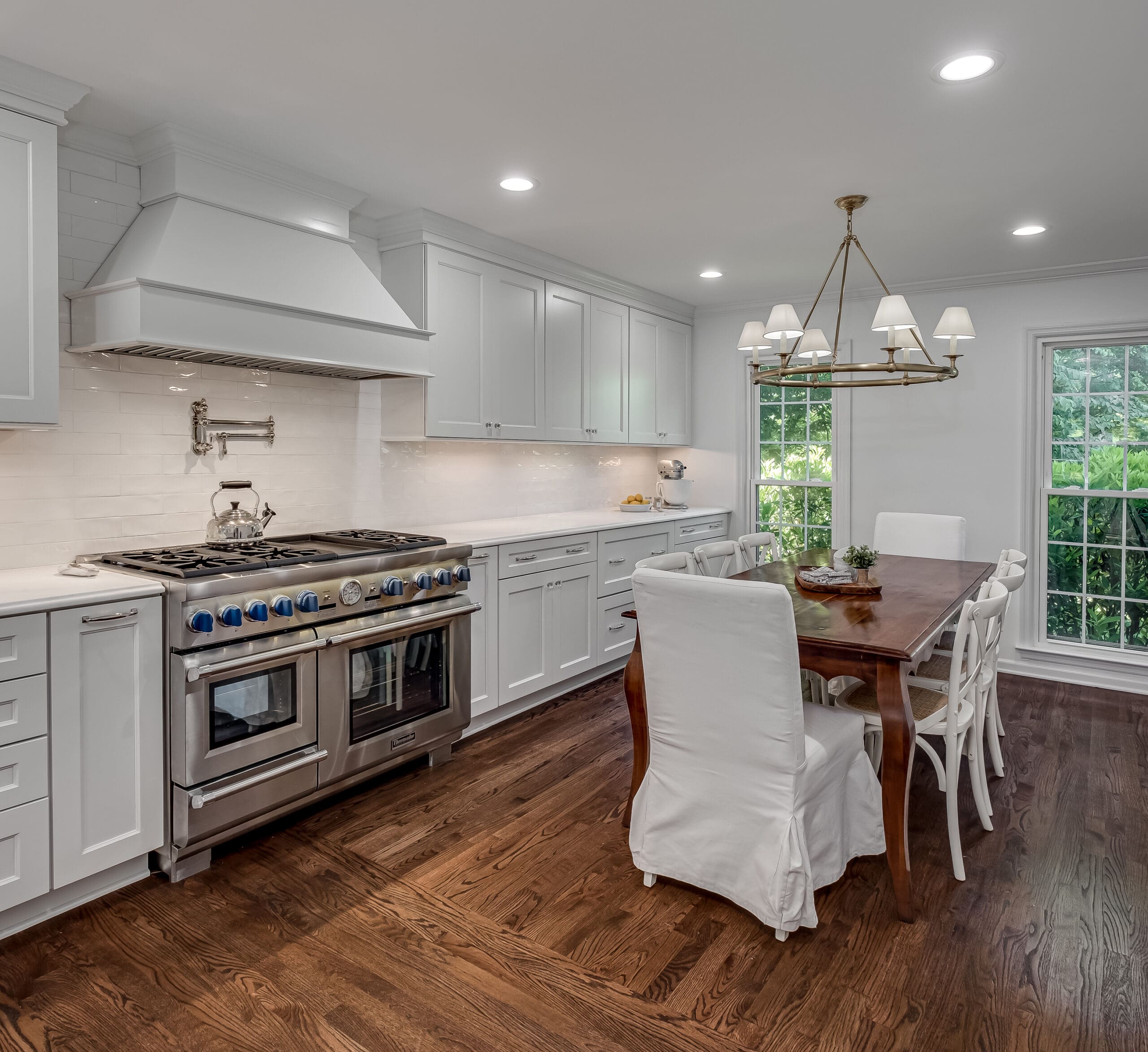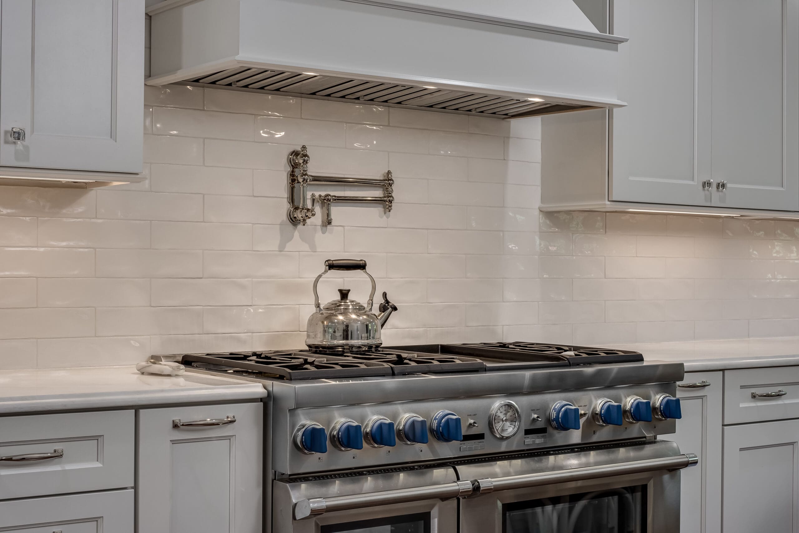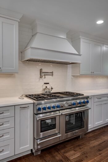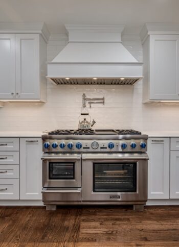 - Incorporated a 48″ professional range + statement hood with a built-in pot filler for elevated cooking